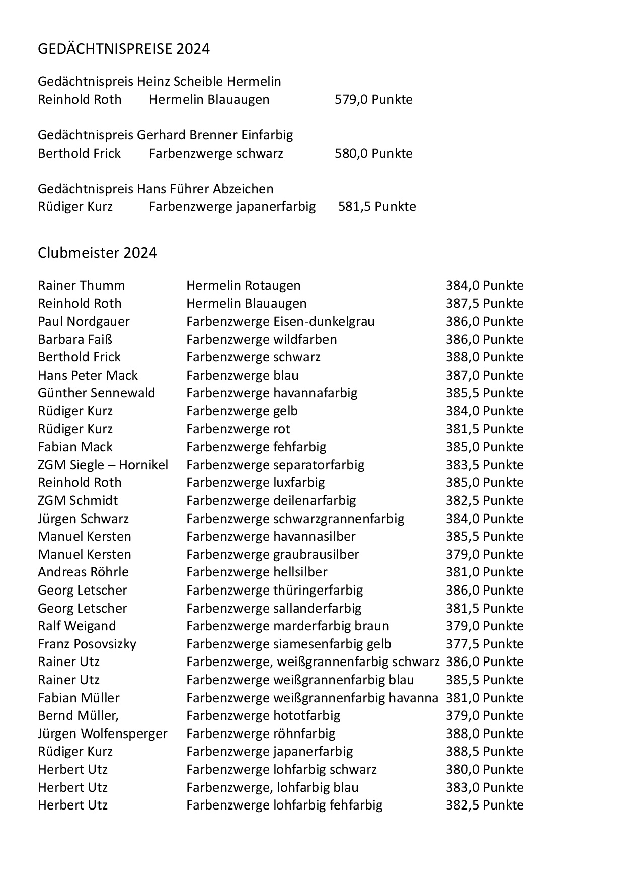 Clubmeister wurden dieses Jahr Rainer Thumm Hermelin Rotauge 384,0 Punkte; Reinhold Roth Hermelin Blauauge 387,5 Punkte; bei den Farbzwergen: Paul Nordgauer eisen-dunkelgrau 386,0 Punkte;